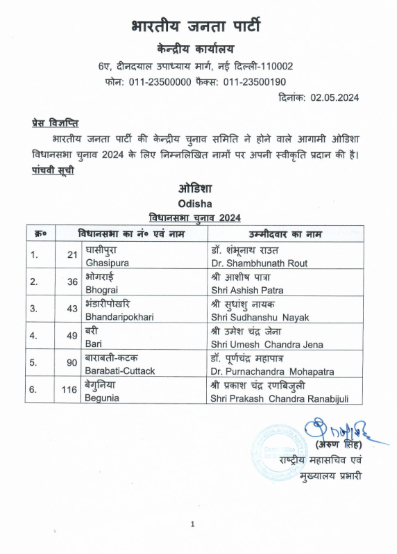 ओडिशा के आगामी विधानसभा चुनाव के लिए भाजपा ने छह उम्मीदवारों के नामों की सूची जारी की है। राज्य में 13 मई और 20 मई को विधानसभा चुनाव होने वाले हैं। इस सूची में घासीपुरा से शंभूनाथ राउत, भोगराई से आशीष पात्रा, भंडारीपोखरि से सुधांशु नायक, बरी से उमेश चंद्र जेना, बाराबती-कटक से पूर्णचंद्र महापात्र और बेगुनिया से प्रकाश चंद्र रणबिजुली का नाम शामिल है।